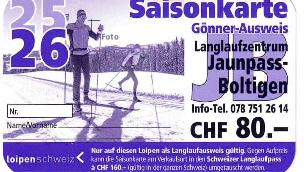 Gerne nehmen wir auch Gönnerbeiträge entgegen. Dieser Beitrag ermöglicht dem Langlaufzentrum Jaunpass-Boltigen die Bereitstellung von Winterwanderwegen und Loipen. Weniger